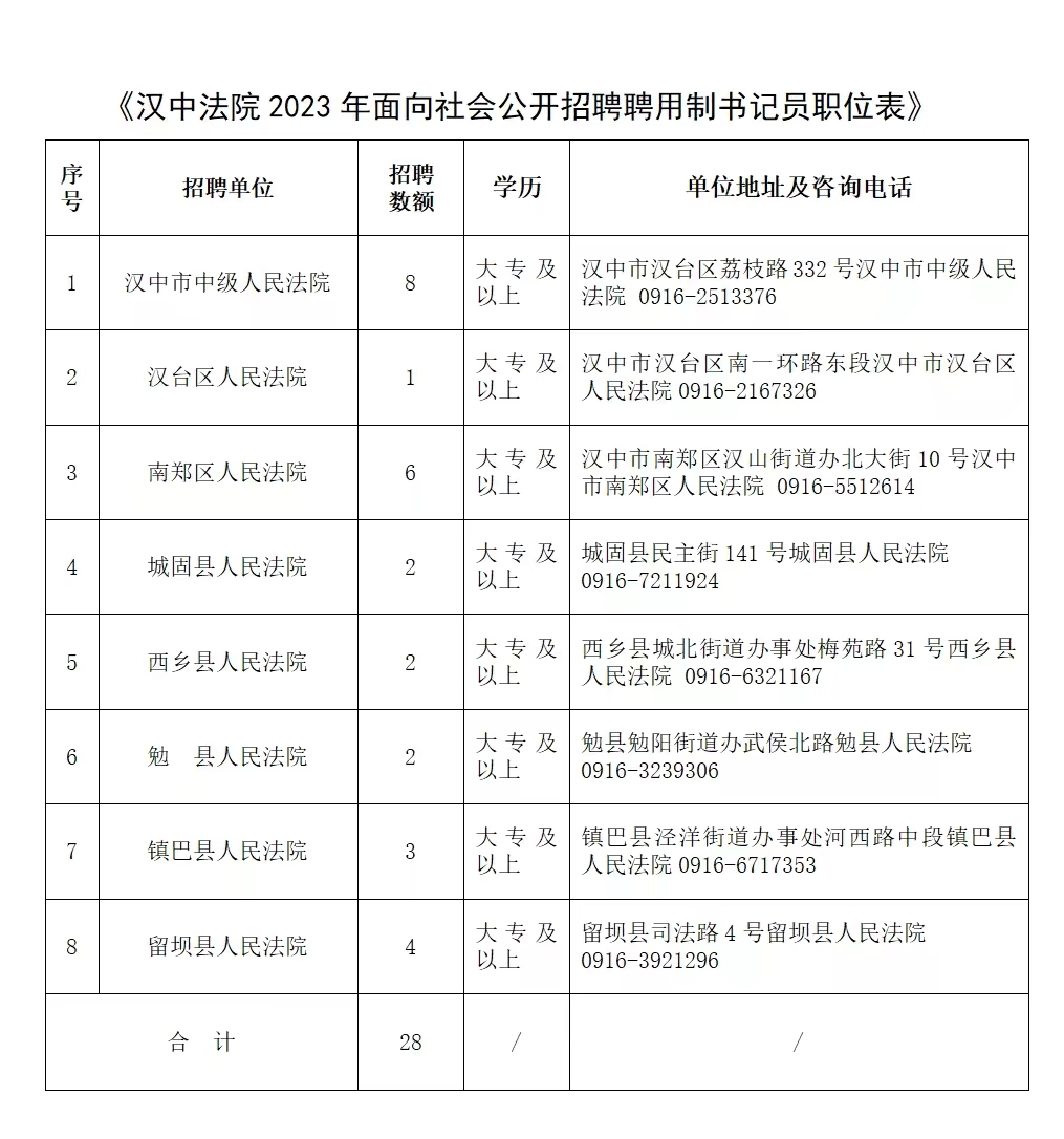 全市法院共招聘聘用制書(shū)記員28名,各法院招聘職位、地址及政策咨詢(xún)電話(huà)詳見(jiàn)《漢中法院2023年面向社會(huì)公開(kāi)招聘聘用制書(shū)記員職位表》(附件)。